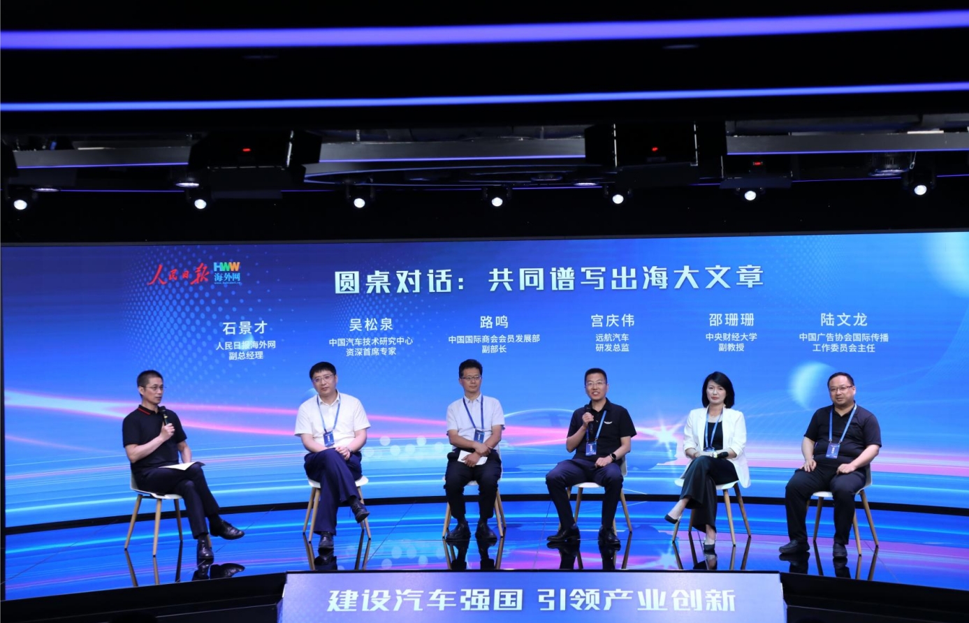 由人民日報海外網副總經理石景才、中國汽車技術研究中心資深首席專家吳松泉、中國國際商會會員發展部副部長路鳴、遠航汽車研發總監宮慶偉、中央財經大學副教授邵珊珊、中國廣告協會國際傳播工作委員會主任陸文龍共同開啟圓桌論壇環節,圍繞“共同譜寫出海大文章”及“新技術助推電安全”的話題,展開了深入而熱烈的討論。