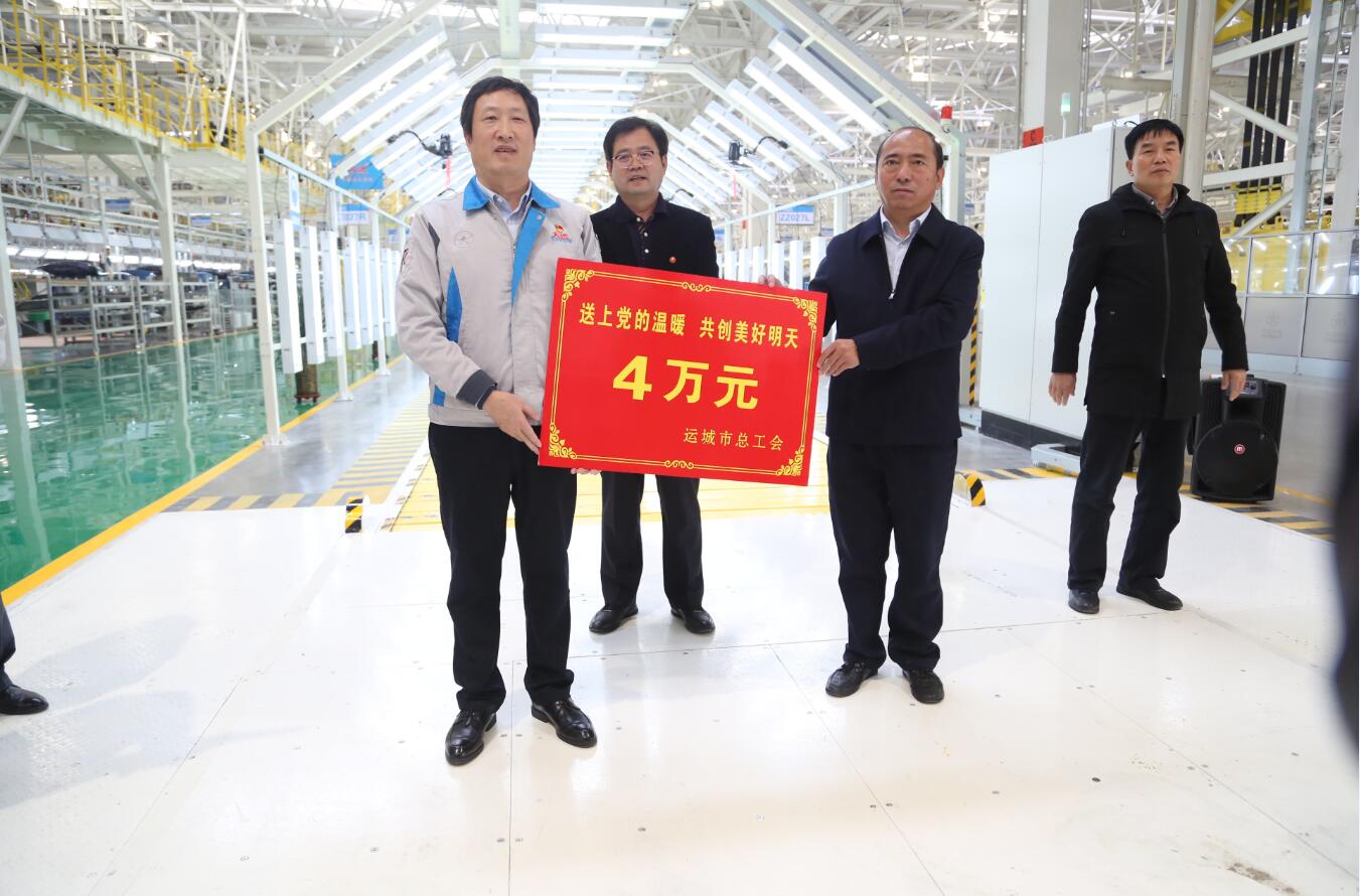 10月16日,運(yùn)城市人大常委會(huì)副主任、市總工會(huì)主席杜自立,運(yùn)城市總工會(huì)黨組書(shū)記、常務(wù)副主席梁武軍,運(yùn)城市總工會(huì)黨組成員、副主席、一級(jí)調(diào)研員秦全發(fā)等領(lǐng)導(dǎo)走訪大運(yùn)新能源汽車(chē)生產(chǎn)基地,慰問(wèn)一線員工并發(fā)放慰問(wèn)金,送來(lái)黨和政府的關(guān)懷。大運(yùn)汽車(chē)股份有限公司工會(huì)主席孫兆明,工會(huì)副主席馬魯堂、周?chē)?guó)軍陪同走訪。